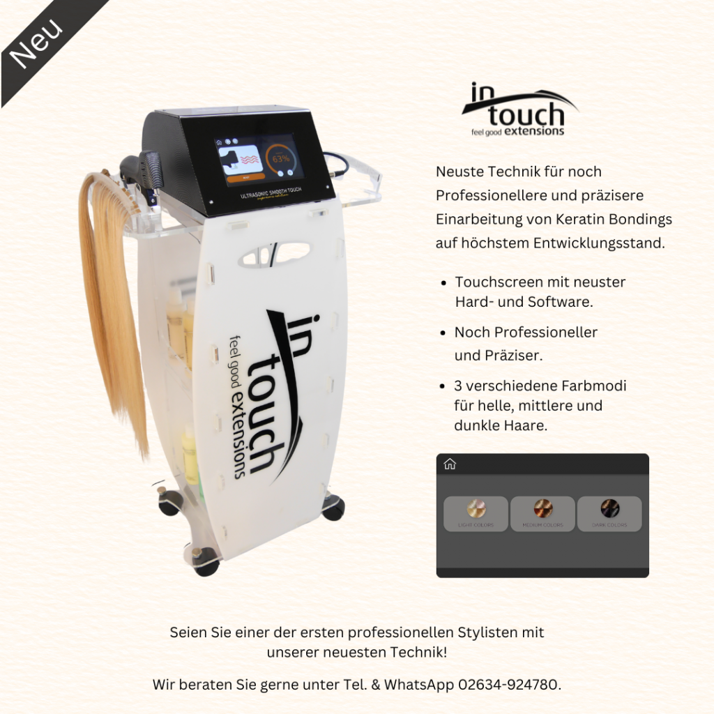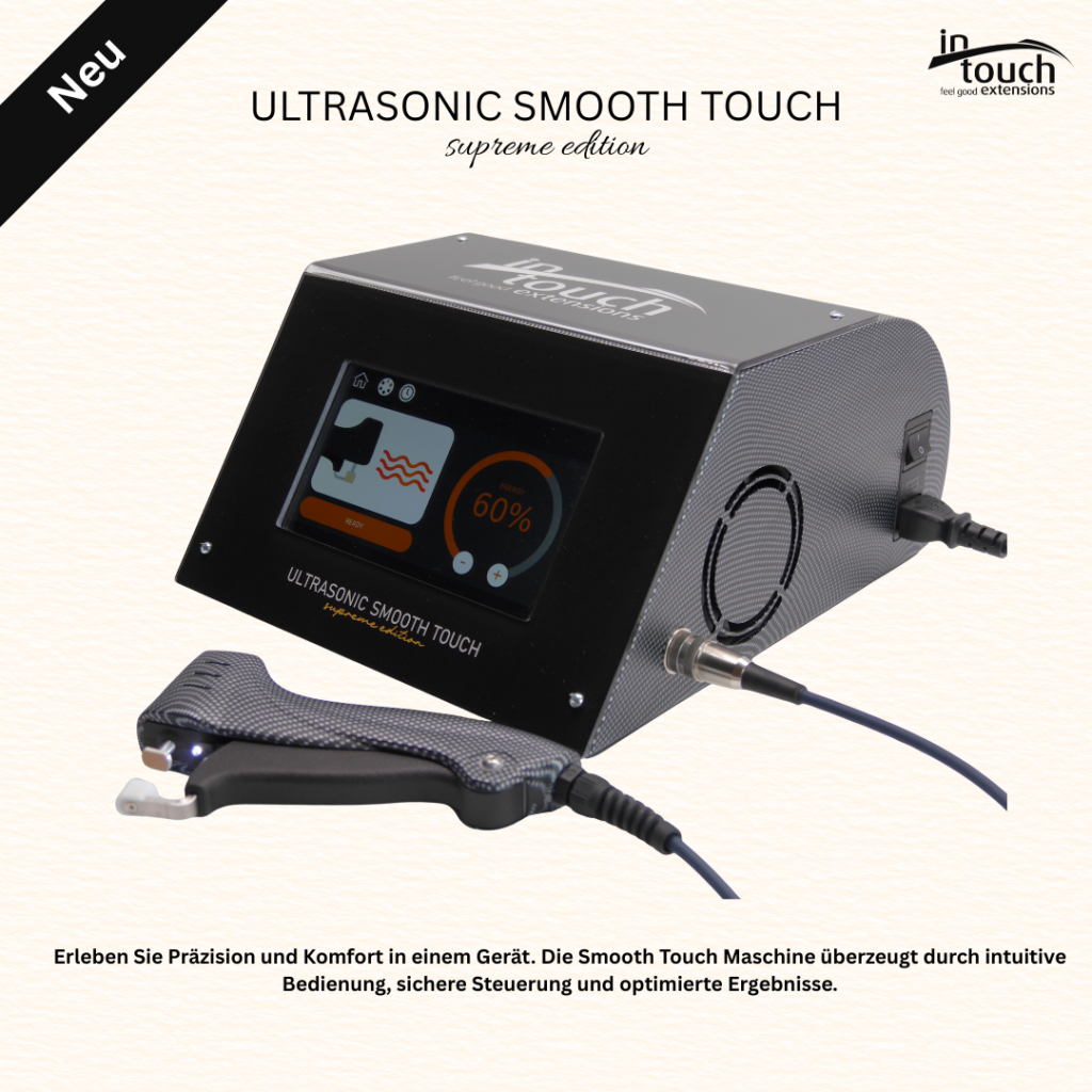 Dank der professionellen und präzisen Einarbeitung durch die neuste Hard und Software erleben Sie eine noch längere Haltbarkeit Ihrer Extensions. De vorab eingestellten Frequenzen sorgen für eine optimale Anwendung, während der benutzerfreundliche Touchscreen die Bedienung erleichtert. Mit ihrem eleganten Design und der verbesserten Form ist die Ultrasonic Smooth Touch nicht nur funktional, sondern auch ein echter Blickfang in jedem Salon. Erleben Sie die nächste Generation der Haarverlängerung und genießen Sie atemberaubende Ergebnisse, die begeistern.